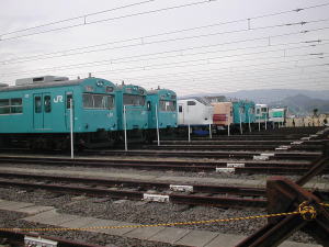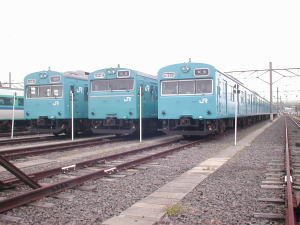 103系6連が3本まとめておかれており、左から冷風車・30N改造車・通常車?です。
