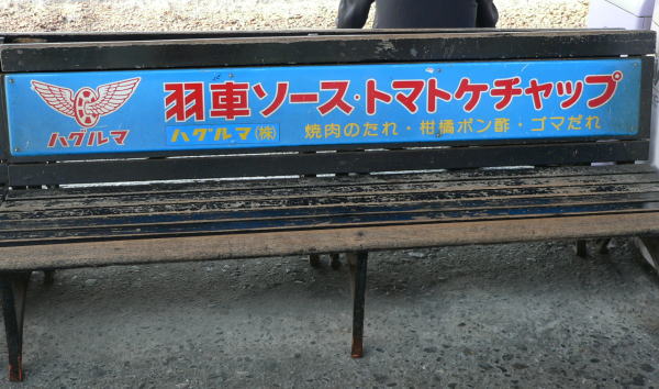 橋本駅のベンチには、ハグルマの羽車ソース・トマトケチャップの広告が貼ってある。