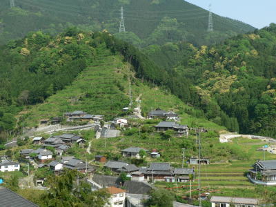 険しい山の麓に、木造住宅が集落を形成しています。