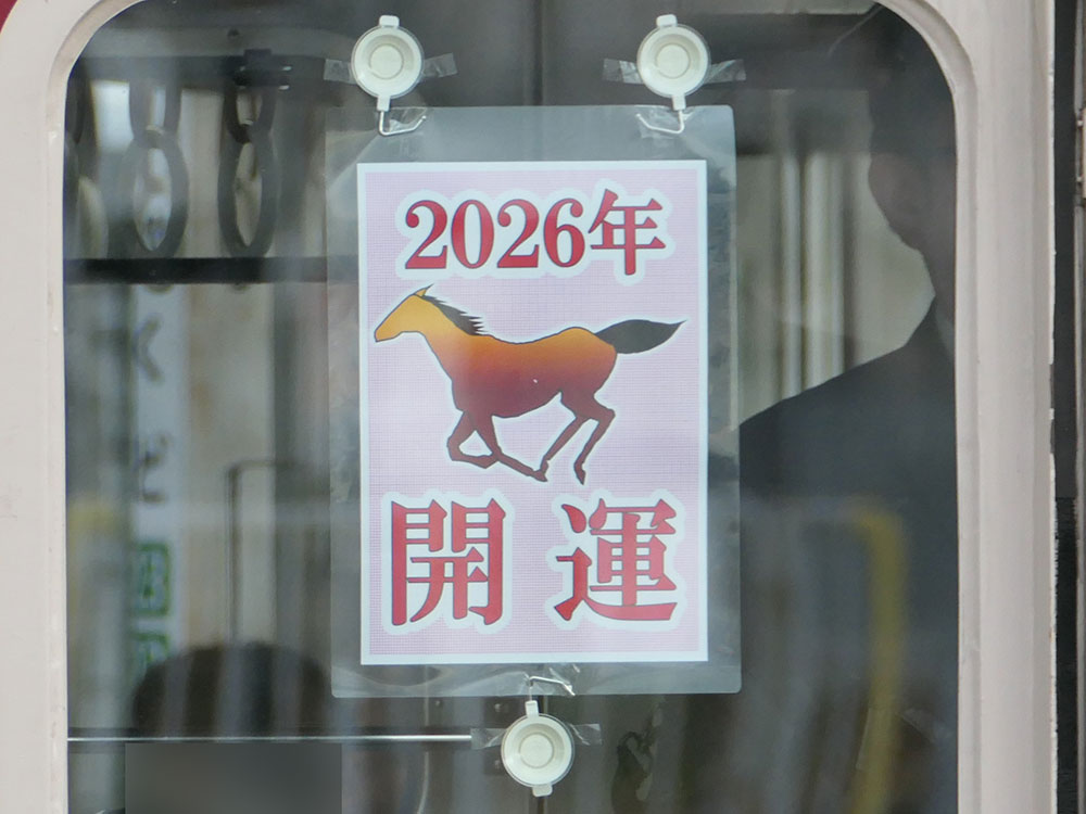 ▼車掌台窓に掲出された2026年海運の午年看板。