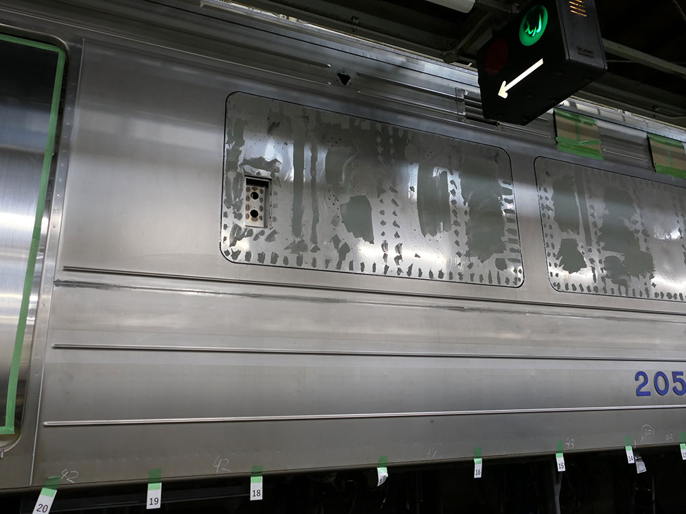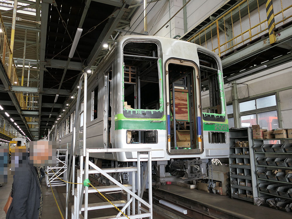 ▼入場中の2000系2001F。なんとCIラッピングの下から、原色の緑色が出てきたようです。